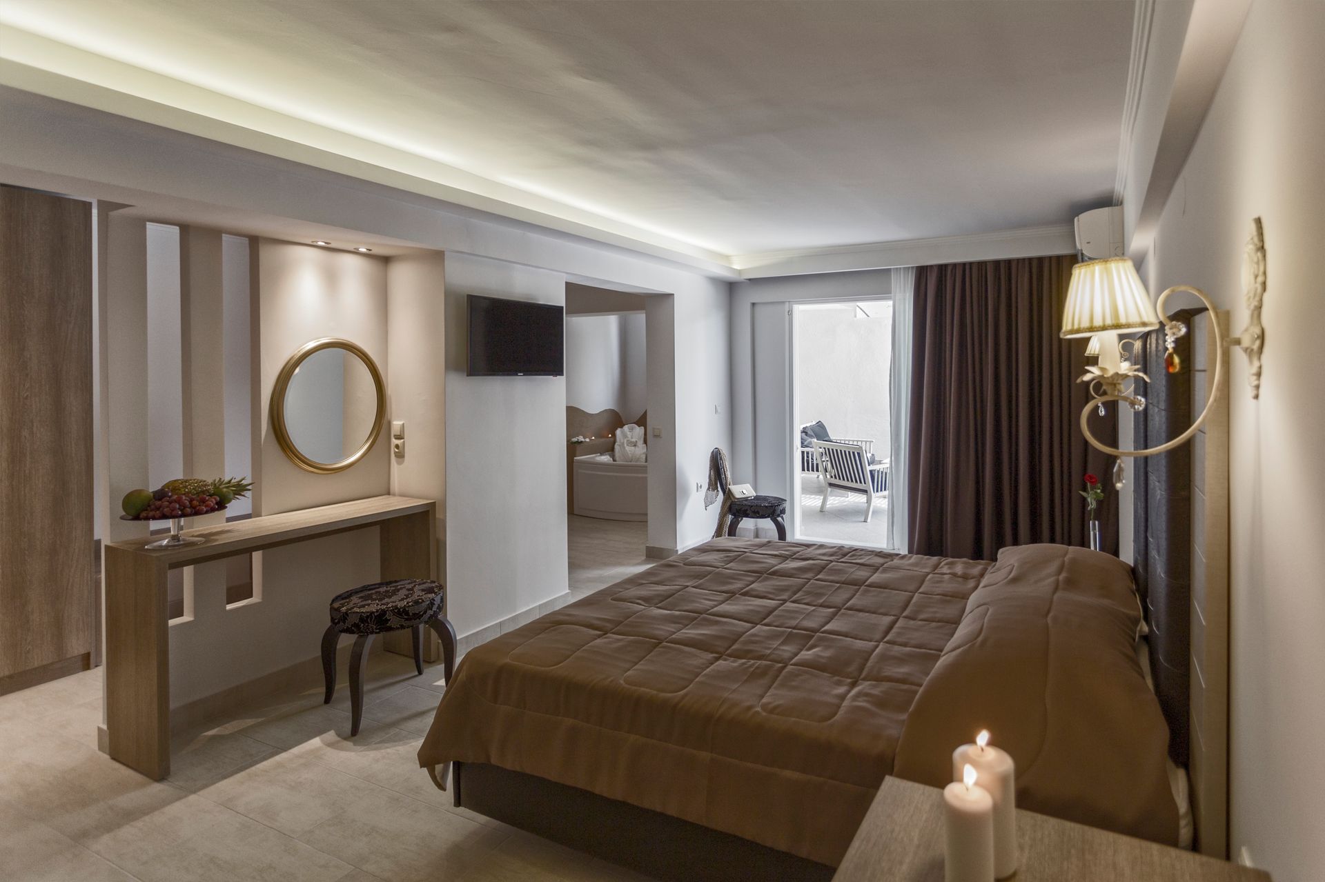 Are located in different parts of Lagomandra Hotel and Spa and have one space big from 28m2 to 35m2 , There are different type of suites that can accomondate couples and for family with kids. Evey room have different decoration and we are doing the best to fullfill your expectation for different type of people like friends coming together couples or family with kids.
